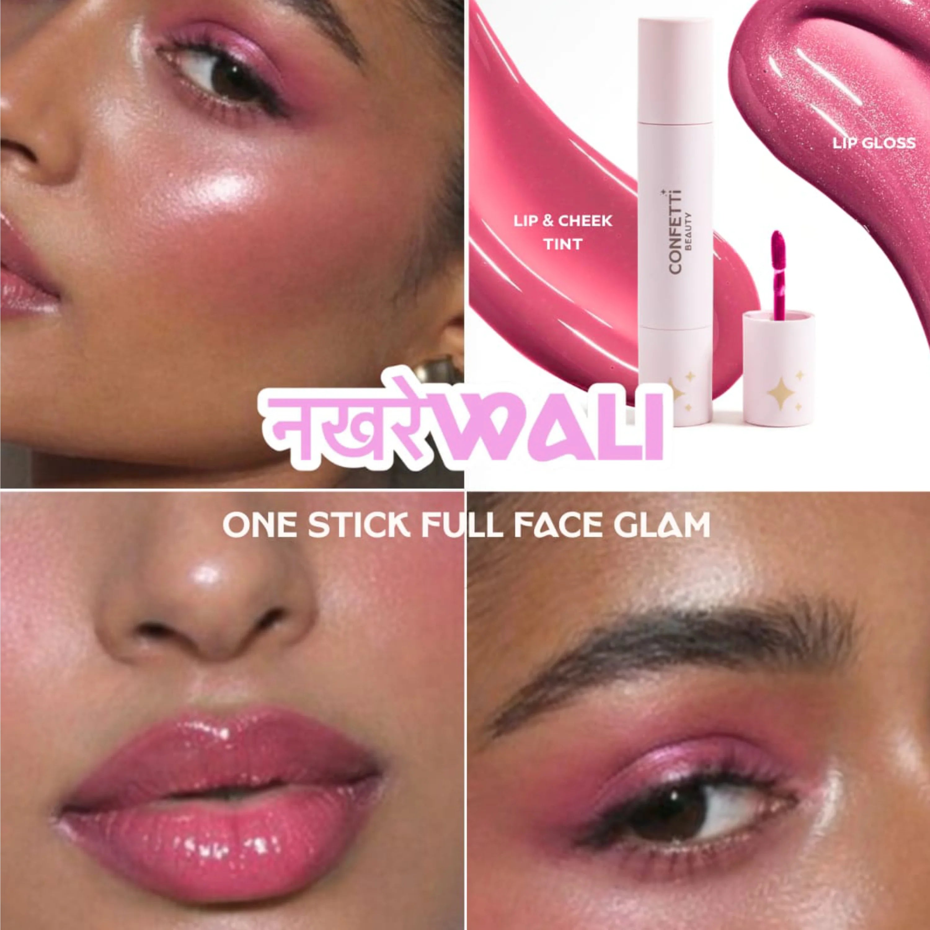 Meet Nakhrewali, your go-to bubble-pink crush that celebrates your spark with every swipe. This water-based lip and cheek tint glides on effortlessly to give you a natural, dewy flush - the kind that looks like you just walked out of a daydream. Top it with the vegan, hydrating gloss for that plumped, glassy finish, or wear it solo for all-day nourishment. Infused with skin-loving ingredients like Squalane, Babassu Oil, and Peptides, it keeps your lips soft, never sticky. 100% vegan, cruelty-free, toxin-free, non-comedogenic, and made safe for young, sensitive skin.